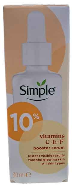 • Simple Vitamins C+E+F Booster Serum (৩০ মি.লি.) – শক্তিশালী অ্যান্টিঅক্সিডেন্ট সমন্বয়, যা ত্বকে তাৎক্ষণিক গ্লো ও সুরক্ষা প্রদান করে।